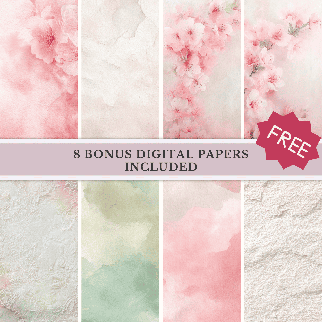 🎨 12 Bonus Watercolor Digital Papers – soft ballet pink, sage mist, and ivory pearl textures