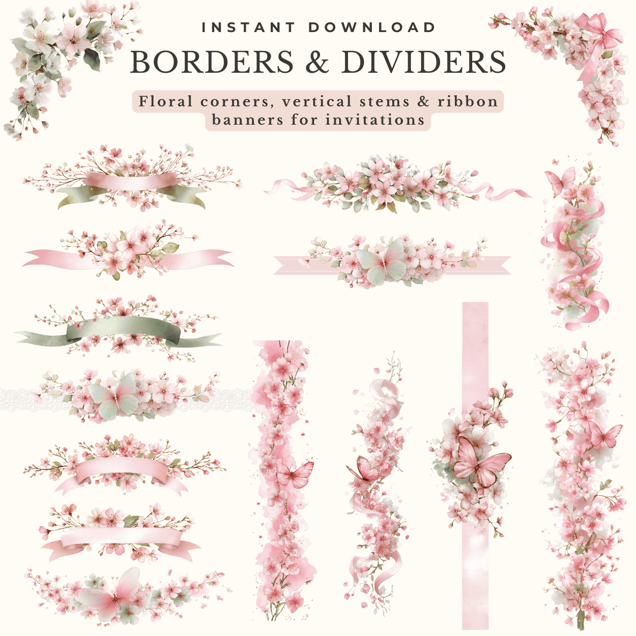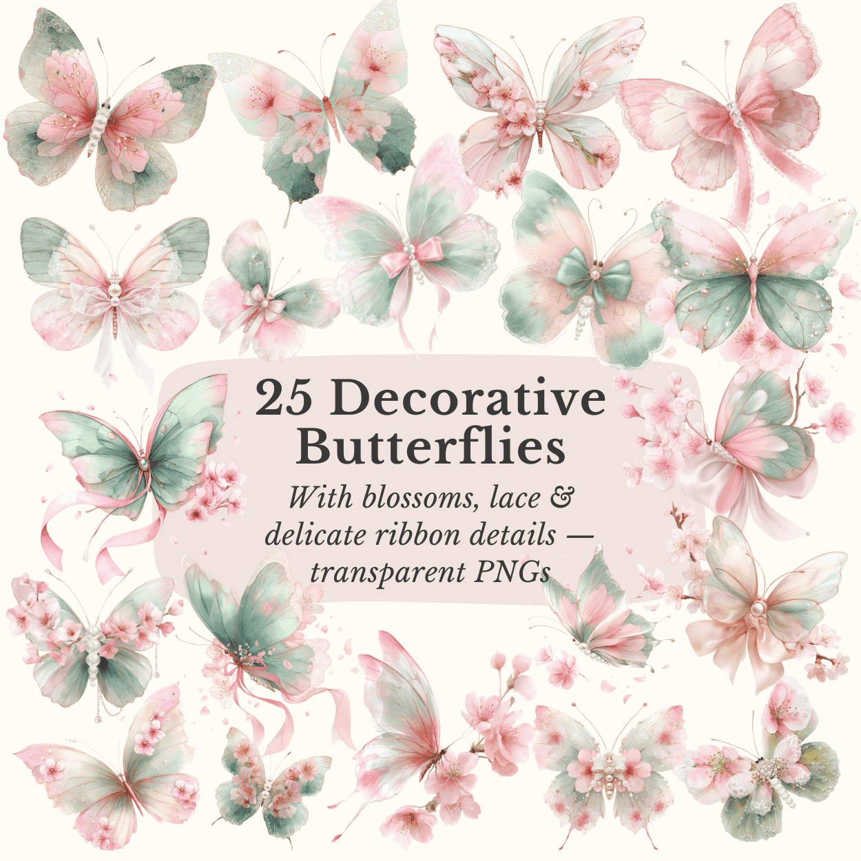 Featuring graceful butterflies adorned with cherry blossoms, satin bows, lace, and pearls — this elegant collection is perfect for wedding invitations, stationery, scrapbooking, and feminine design projects.