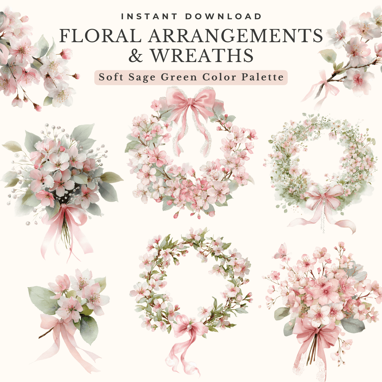 Each element is hand-painted in gentle ballet pink and muted sage green tones to evoke a feeling of timeless femininity and grace — perfect for wedding invitations, bridal shower stationery, journals, branding, wall art, or any romantic creative project.