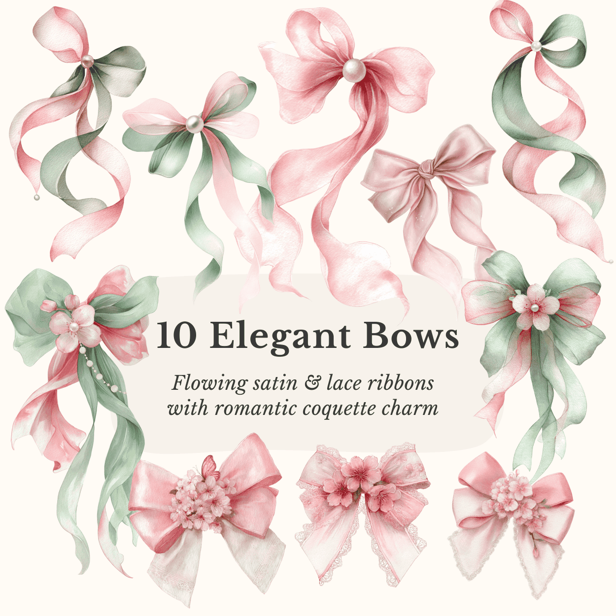 🎀 10 Satin Bows – flowing watercolor ribbons and lace bows