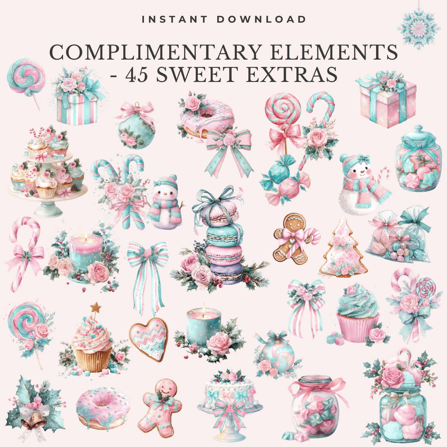 45 Complimentary Elements – sweet extras like candy canes, lollipops, cupcakes, ornaments, gifts, and more.