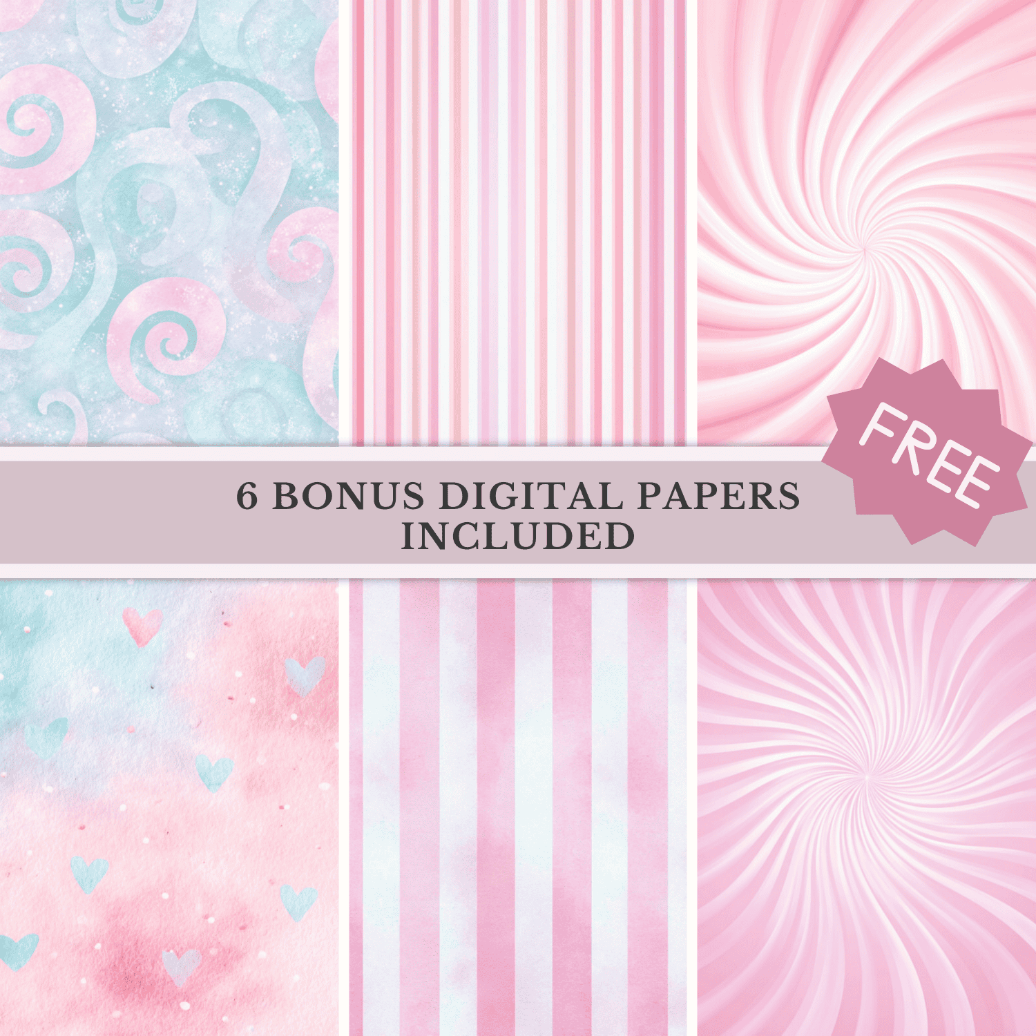 Bonus Digital Papers – 6 soft pastel watercolor backgrounds (stripes, swirls, hearts, snowy dots).