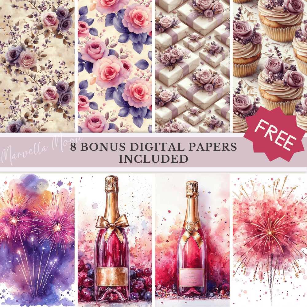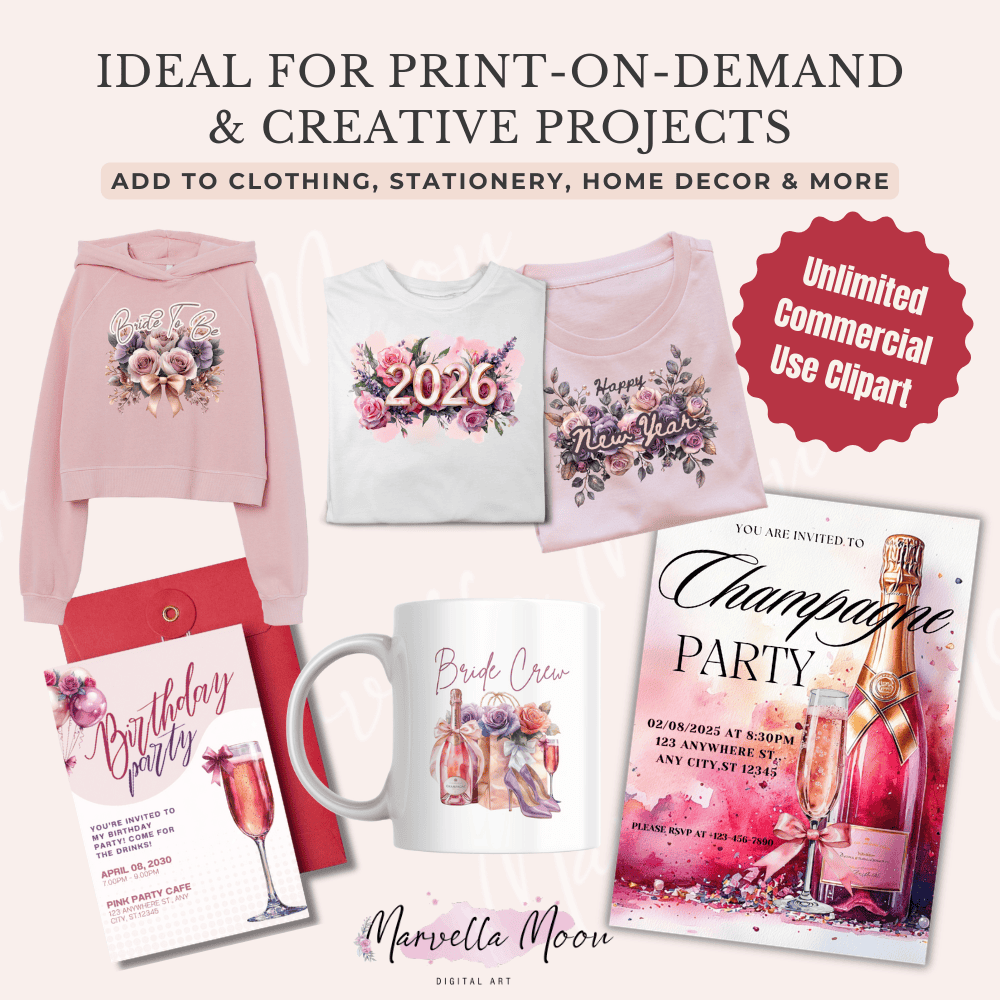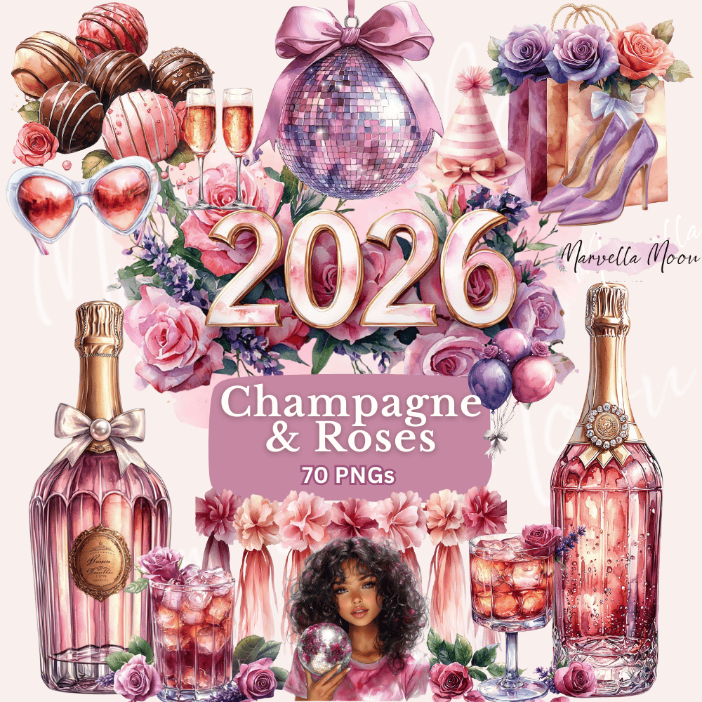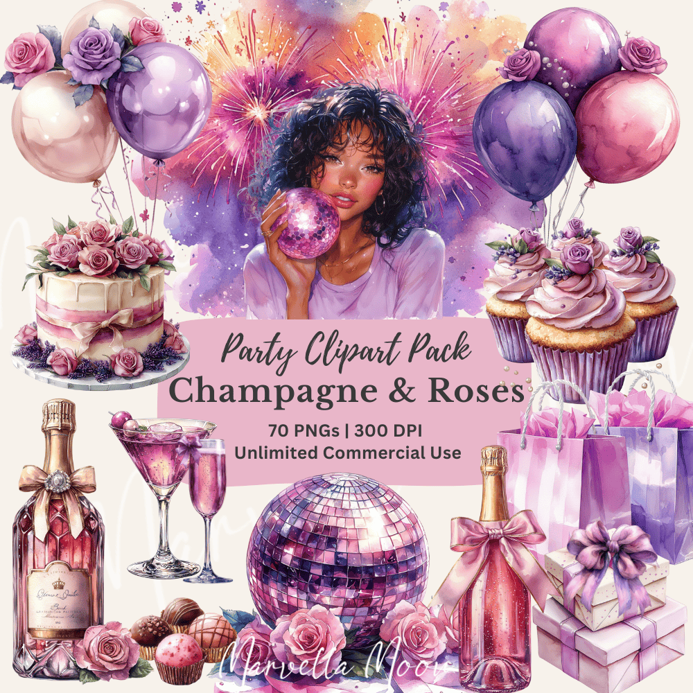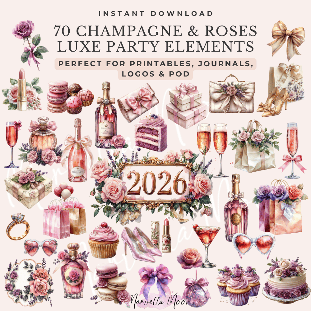 Celebrate in style with the Champagne & Roses Clipart Party Pack. This girly luxe clipart bundle includes elegant champagne glasses, rose-themed décor, feminine party elements, and seamless patterns — perfect for New Year’s Eve, bridal showers, weddings, and bachelorette parties.