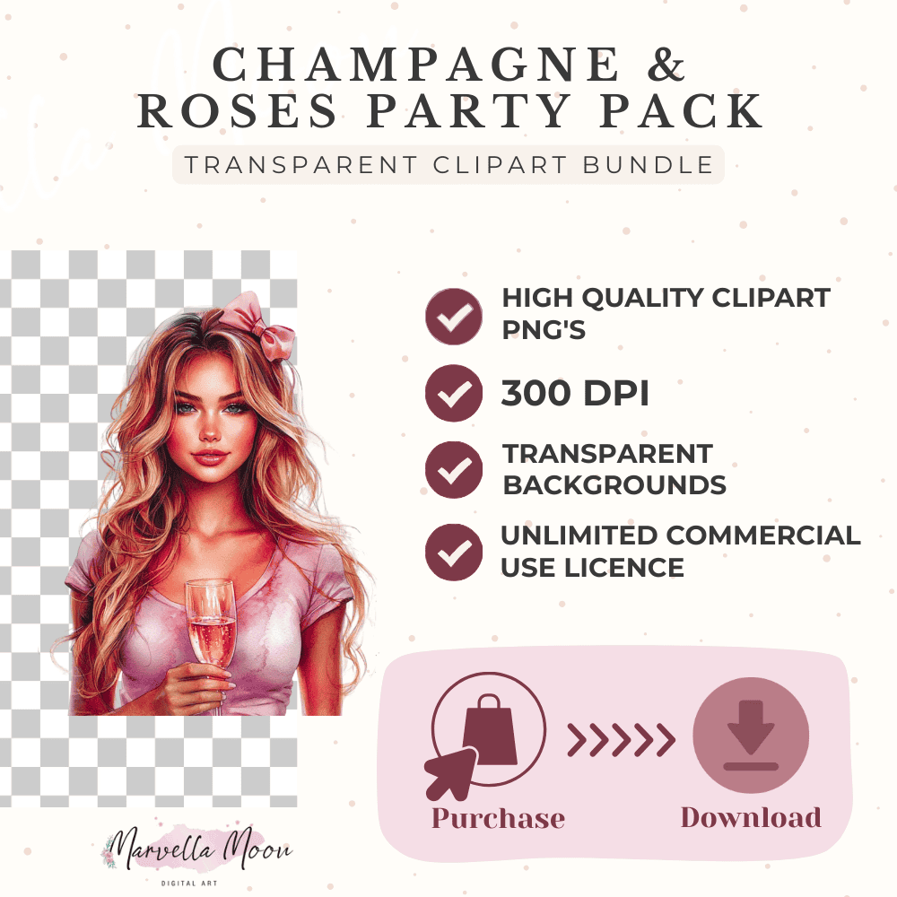 Champagne Clipart Bundle – Pink Champagne & Roses Party PNGs with Luxe Elements