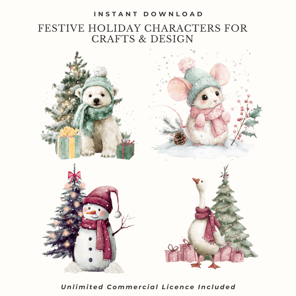 Christmas Winter Animals Clipart: 20 Cute Watercolor PNGs with Snowy Backgrounds for Junk Journals & Holiday Card Making (Digital Download)