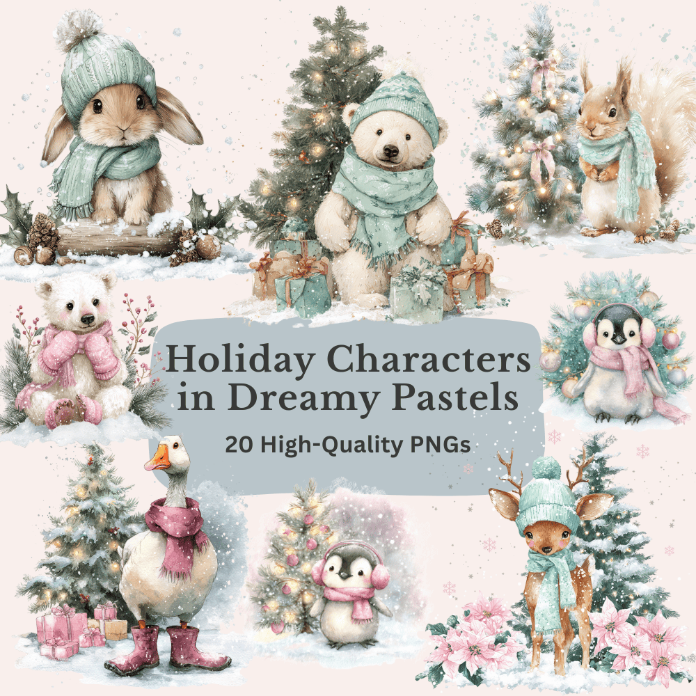 Bring whimsical holiday charm to your creative projects with the Christmas Winter Animals Clipart Bundle. This magical set includes 20 unique transparent PNGs, lovingly illustrated in a soft watercolor style with delicate pencil details and pastel holiday tones. Each character comes with a festive snowy background, making this bundle perfect for Christmas crafts, digital designs, and seasonal stationery.