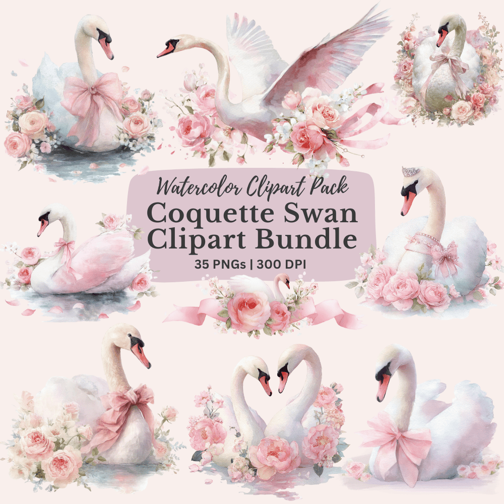 Bring romance and elegance to your creative projects with the Coquette Swan Clipart Bundle. This dreamy collection features 35 high-quality watercolor PNGs, including graceful swans, roses, jasmine, bows, lace frames, pearl accents, floral bouquets, and ribbon banners. Perfect for wedding invitations, planners, journals, stickers, branding, and sublimation projects.