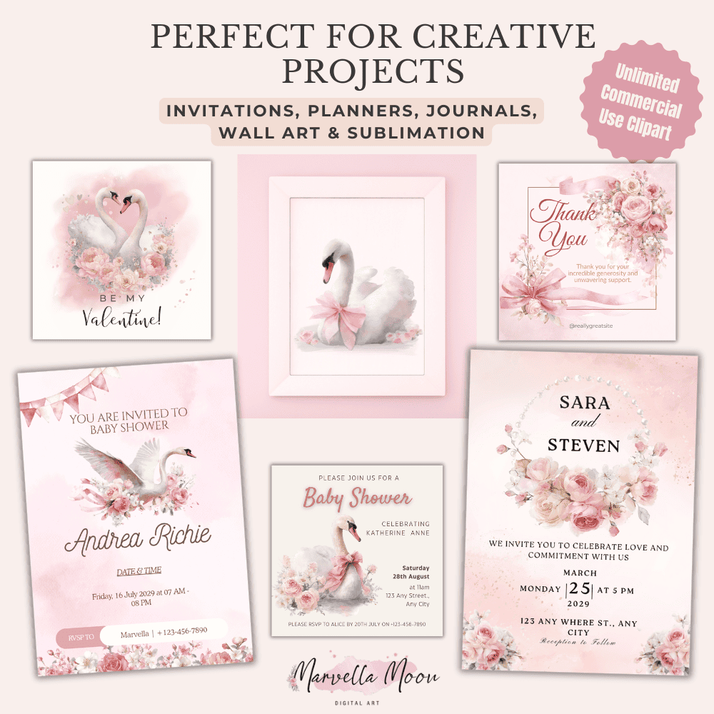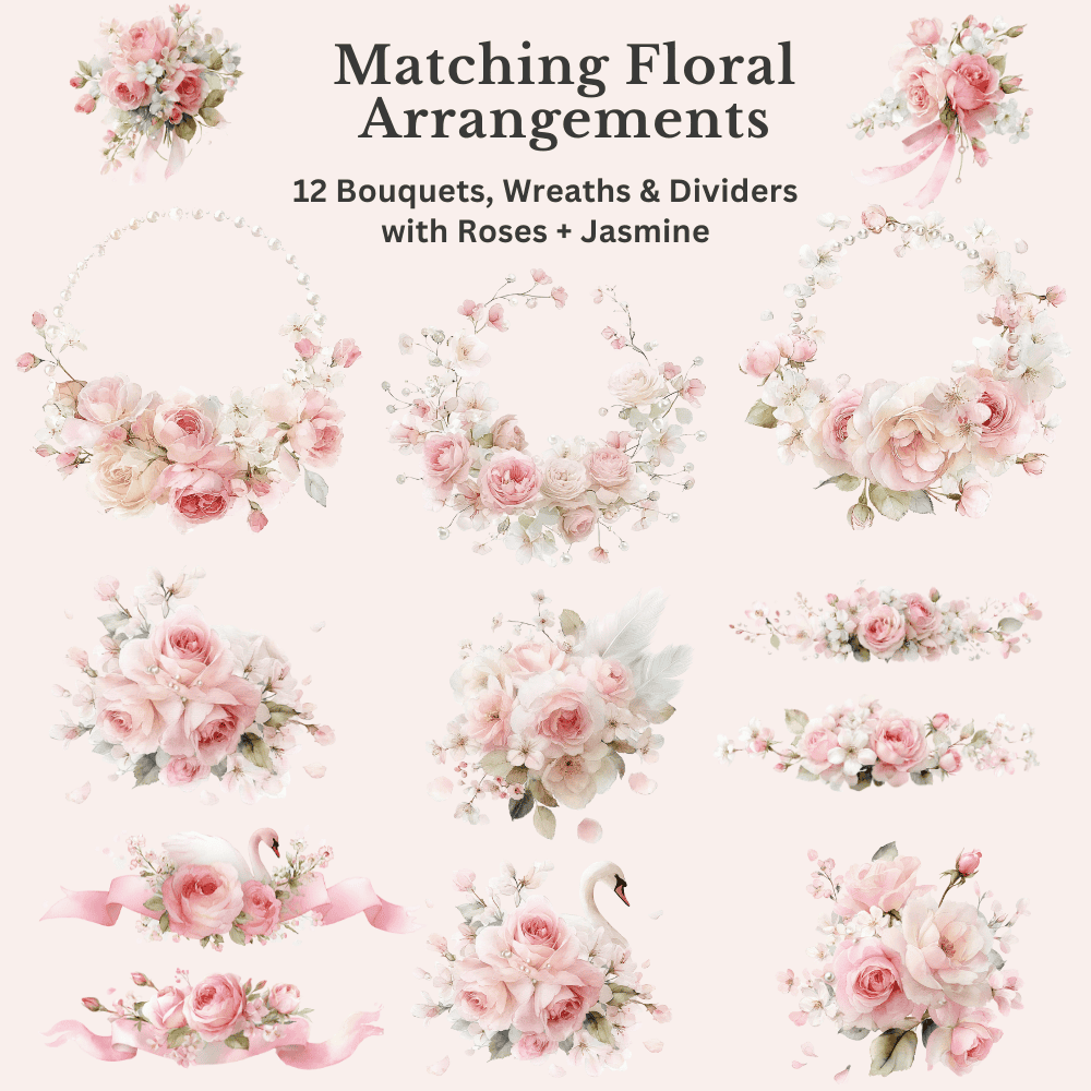 Create projects that feel whimsical, elegant, and romantic with this versatile clipart set. The swans, roses, jasmine, and delicate pearl accents bring soft luxury to any design.
