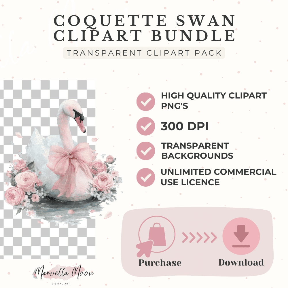 The Coquette Swan Clipart Bundle is a romantic collection of soft watercolor clip art featuring graceful swans, roses & jasmine, and accented with cute bows & pearls. Use this clip art for weddings, feminine branding, and dreamy creative projects.