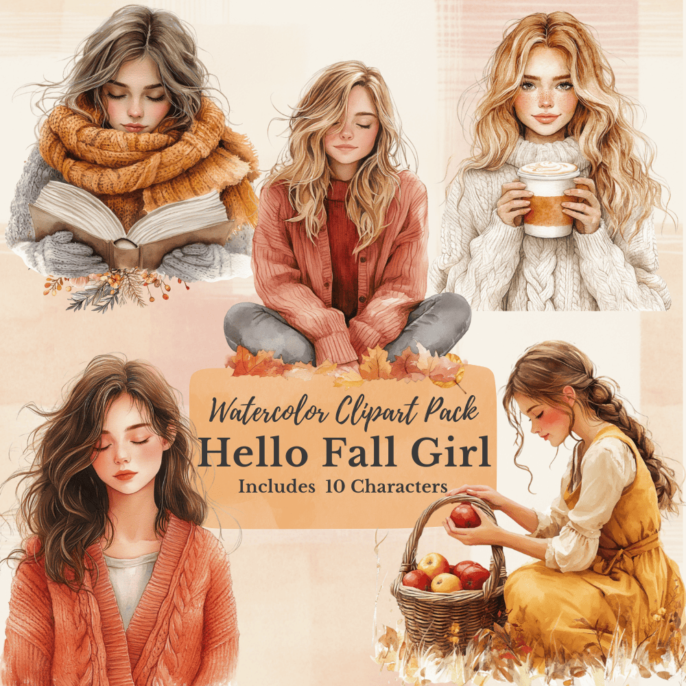 Bring warm, autumn charm to your creative projects with the Hello Fall Girl Clipart Bundle. Designed in a cozy cottagecore watercolor style, this collection blends pumpkin spice hues, dusty rose, mustard, terracotta, and cream to create soft, seasonal magic.