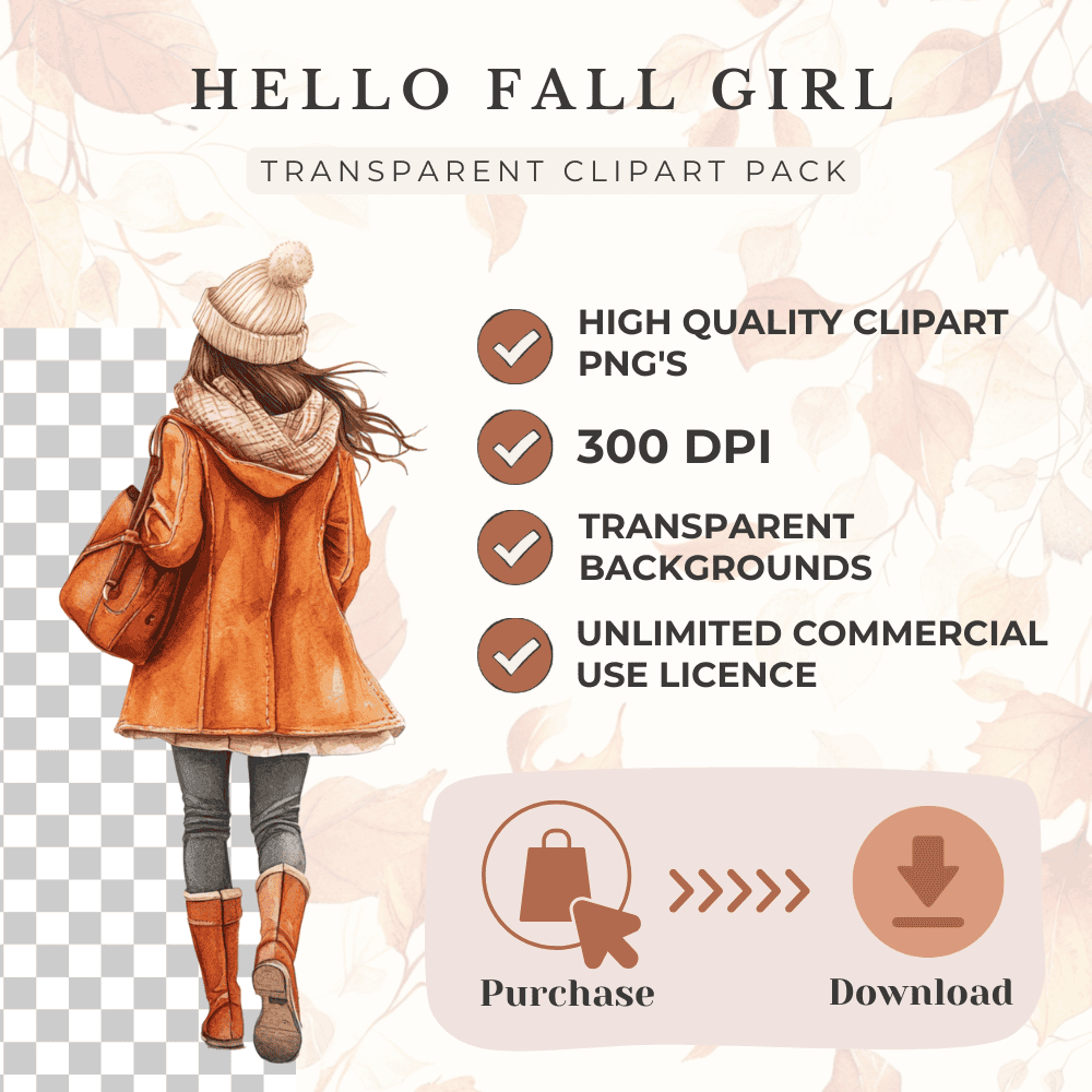 Hello Fall Girl Clipart – 35 Cozy Cottagecore Watercolor PNGs | Autumn Characters, Florals & Bonus Digital Papers