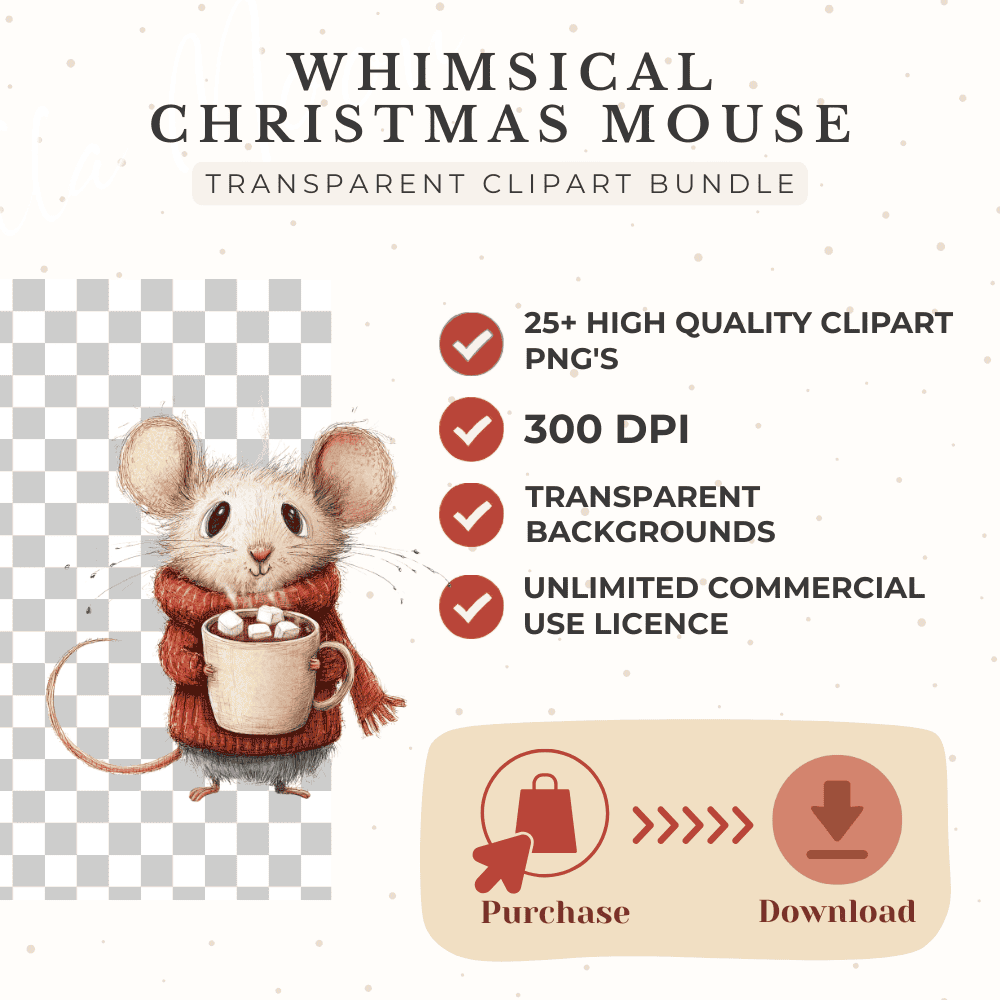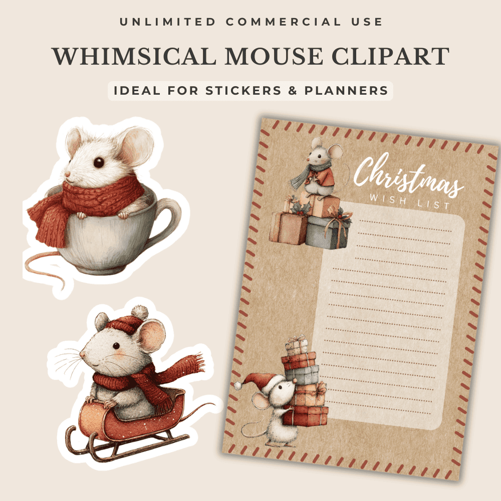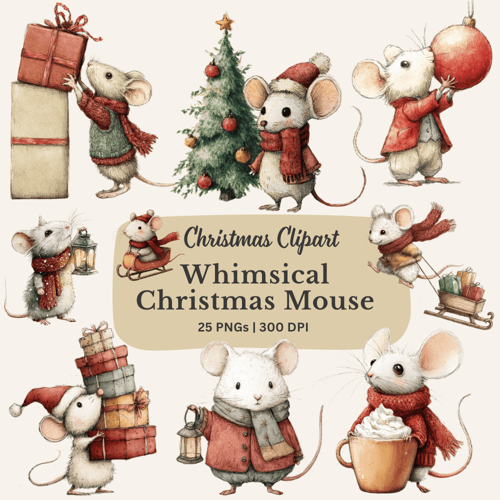 Bring a cozy, storybook charm to your holiday designs with this whimsical Vintage Christmas Mouse Clipart Bundle. Featuring 25+ hand-drawn illustrations in soft pastel watercolor, perfect for cards, stickers, gift tags, planners, scrapbooking, and festive DIY projects. High-resolution PNGs with transparent backgrounds.