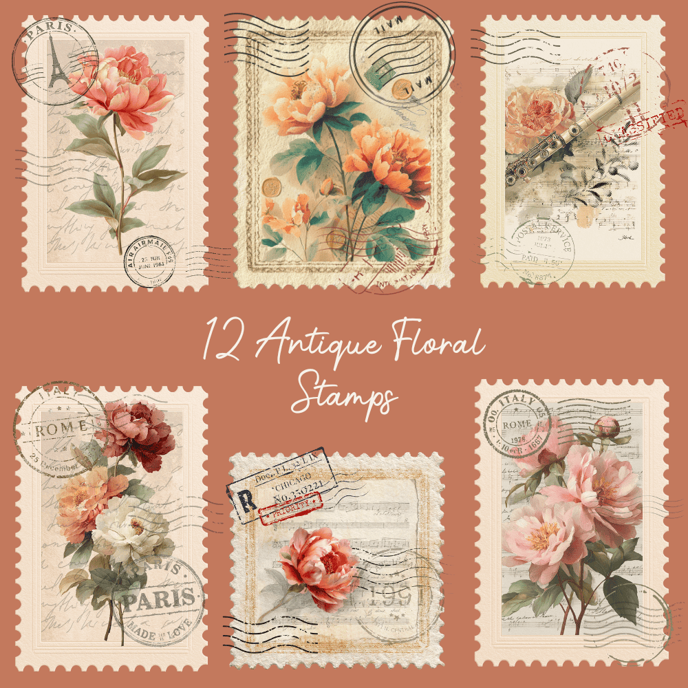 This bundle includes 12 carefully curated vintage postage stamp designs, combining floral artwork, subtle postmarks, handwritten textures, and classic perforated edges. The stamps are ideal as standalone decorative elements or as layered accents within larger compositions.
