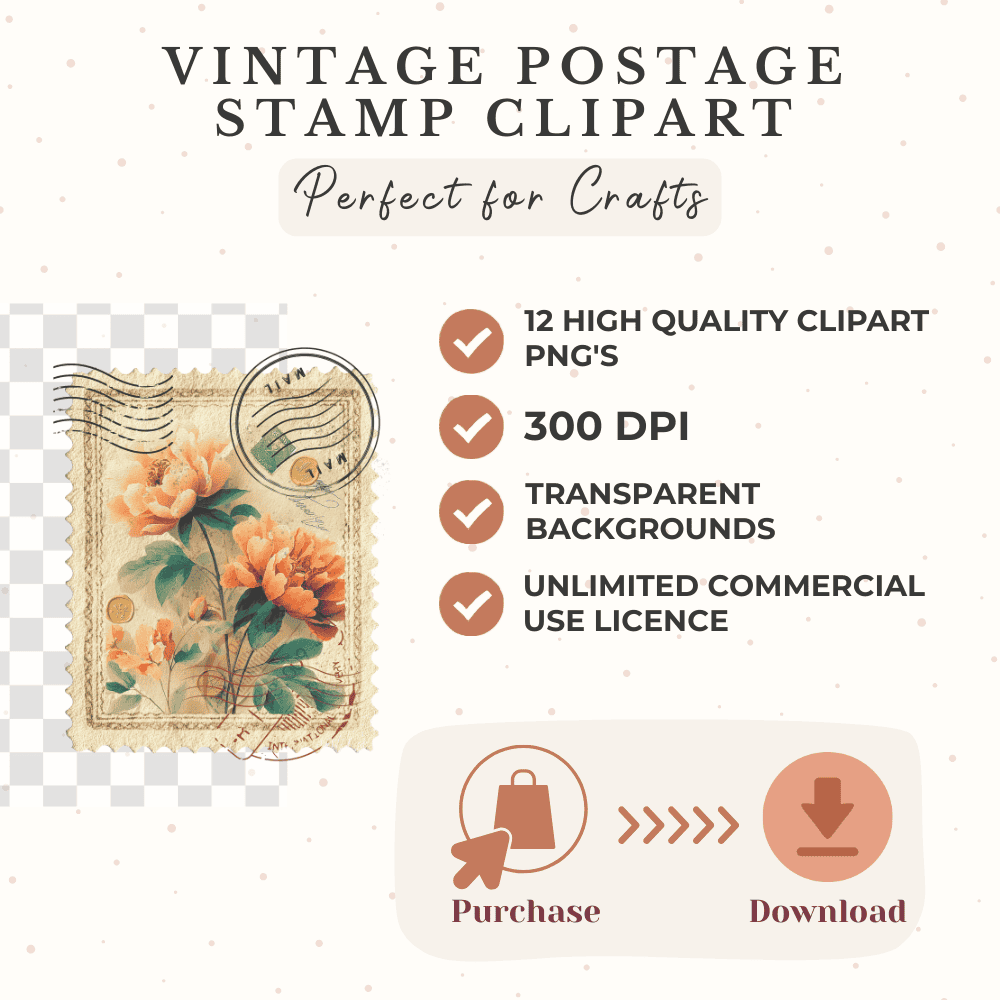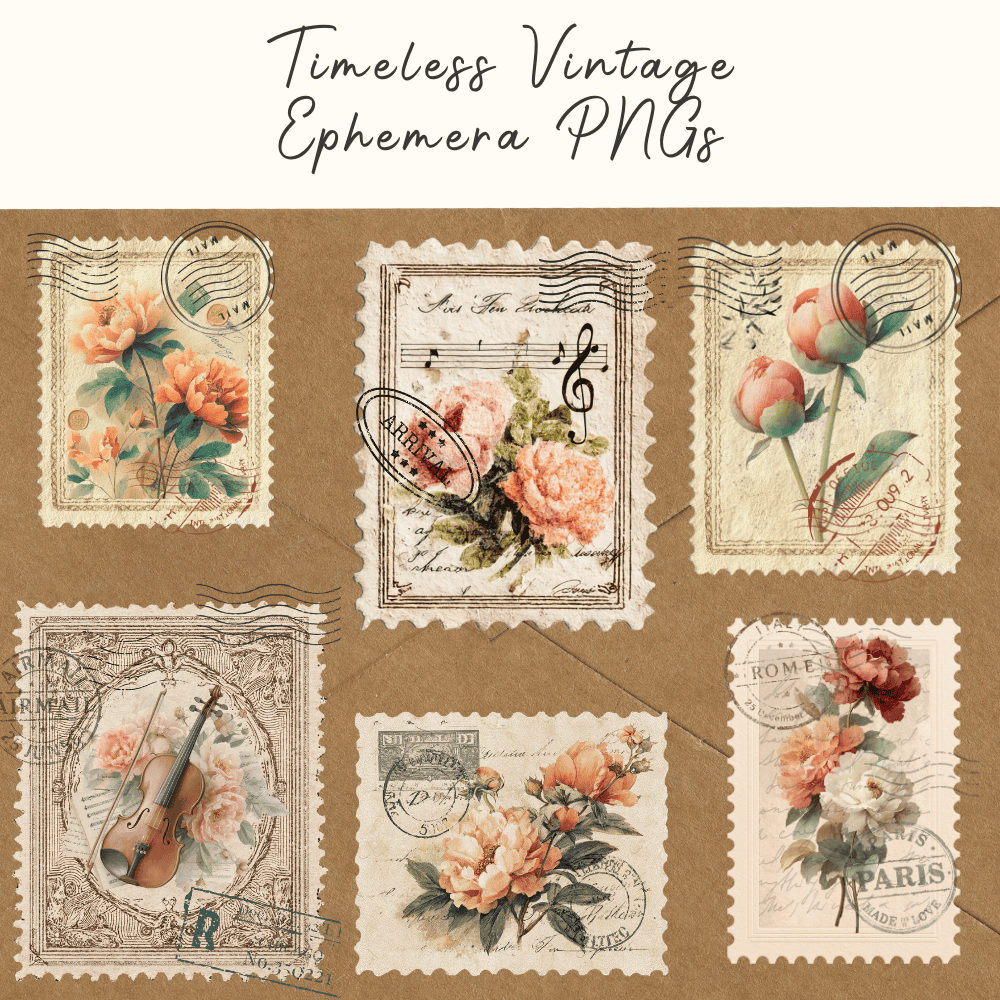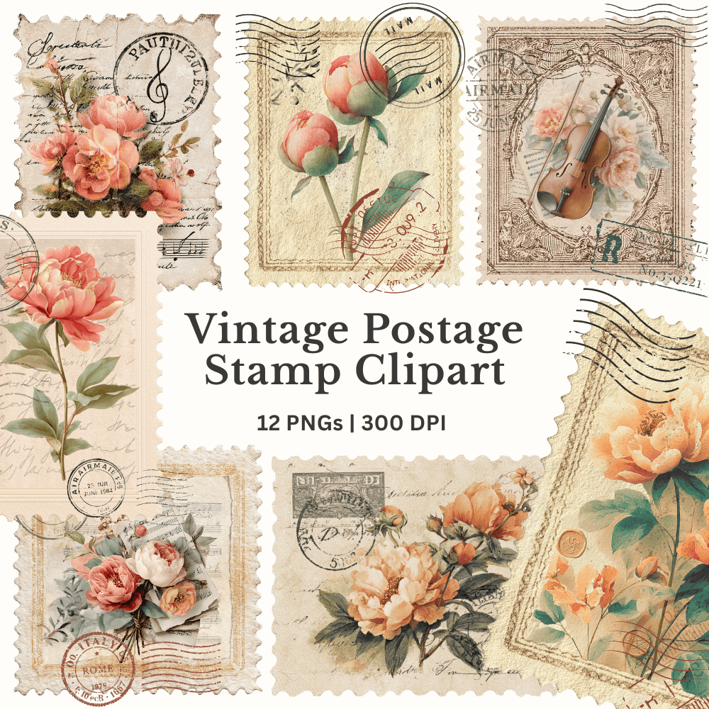 Vintage Postage Stamp Clipart | 12 Timeless Floral & Antique Ephemera PNGs